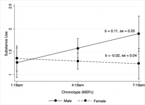 We also have examined associations between adolescent chronotype substance use and risky behavior. Findings within the ethnically diverse sample demonstrated that an evening chronotype is associated with more risky behaviors and substance use among males, and more substance use among older adolescents. Substance use was also positively associated with an evening chronotype among all adolescents in the Mexican-American sample.