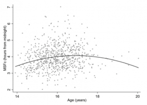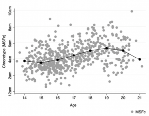 Research from our lab recently published by the Journal of Youth and Adolescence examined developmental age trajectories of chronotype among a sample of ethnically diverse adolescents. We measured chronotype with the mid-sleep point between bed and wake times the night before “free,” or unscheduled days (MSFc). We found that chronotype delayed toward eveningness from 14 to 19 years followed by a return toward morningness after age 19.